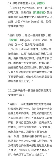 这是当我回过头来看去年看过的电影里,在情感上最打动我的一部。对我来说它无关男女,无关阶级,只关于一个在现代生活中失去爱人能力的伤心人。 在电影手册对拉斯冯提尔的专访中有这样一段对话,描述他为了避免厌女的指控改变主角的选取,然而这样的转变很显然并不代表他创作方向和议题深度有不同,因为他的电影总是关于人类共性的情感与欲望。